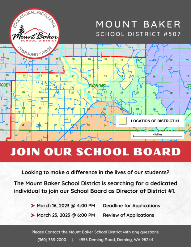 The Mount Baker School District is searching for a dedicated individual to join our School Board as Director of District #1*.