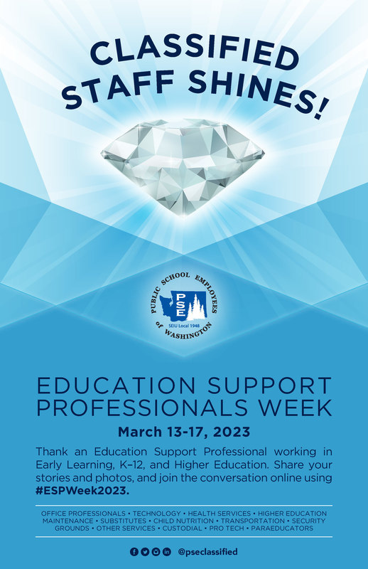 March 13-17, 2023 is Education Support Professionals Week (formerly Classified Week), a tradition started in 1975 by PSE to recognize the contributions of Education Support Professionals in the public school system. It is a statewide celebration to recognize ESPs for the difference they make in our schools and universities, and let them know what it means to belong in a union.