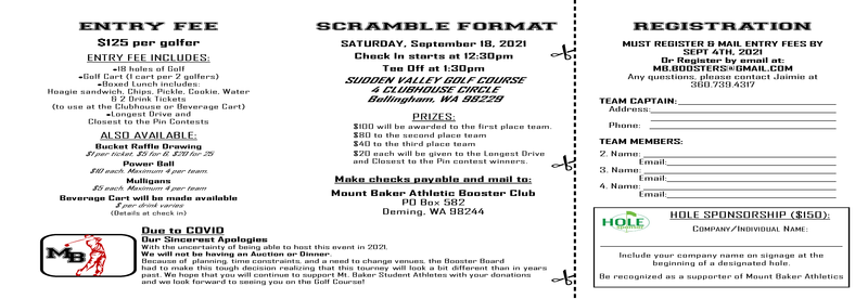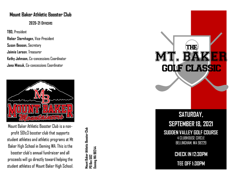 The Mount Baker Athletic Booster Club is hosting the 2021 Mount Baker Golf Classic to raise funds for our student athletes. This event helps to fund four scholarships as well as other needs that our athletic teams may have.
