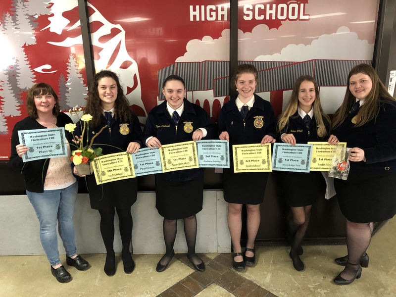 I am so excited to announce that Mount Baker FFA Floriculture team earned 1st place out of 18 teams at the State FFA Floriculture CDE in Castle Rock, WA and earned the opportunity to represent Washington State in Indianapolis, Indiana next fall at the National FFA Convention. Sophia Patten was the 1st high individual, Emma Cook placed 3rd, Lillian Petersen placed 5th, and Piper Estabrook placed 14th with a combined total score of 2897, which is the highest any team has placed at a floral contest this year.