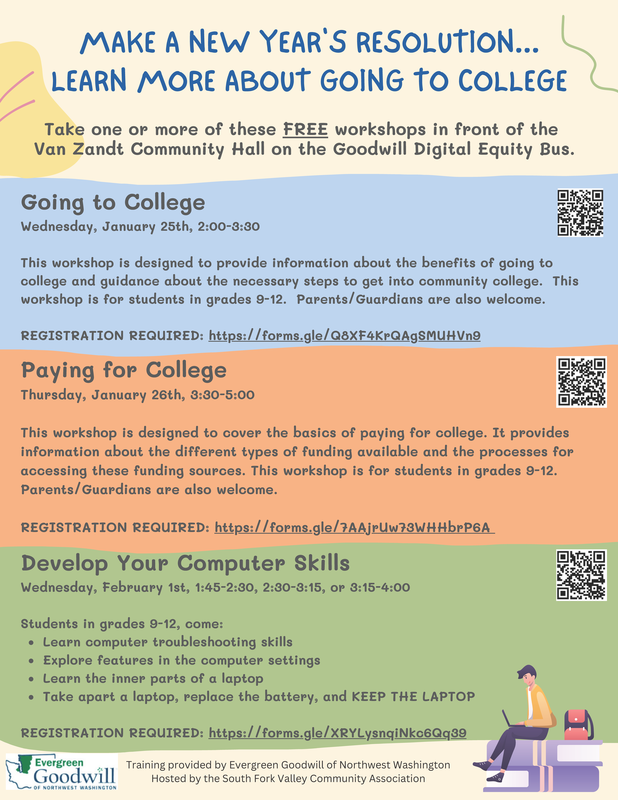 Mount Baker Jr/Sr High School has a bus route that goes to the Van Zandt Community Hall after school that students could ride (with parent permission) to these events!