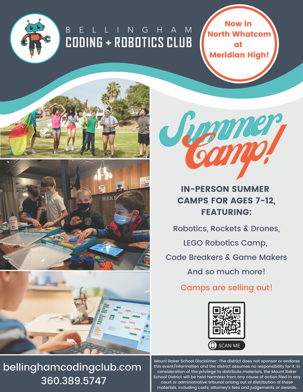 Bellingham Coding + Robotics Club Summer Camp 2022 offers in-person summer camps for ages 7-12, featuring: