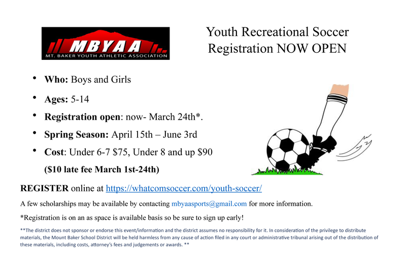 Mount Baker School Disclaimer: The district does not sponsor or endorse this event/information and the district assumes no responsibility for it. In consideration of the privilege to distribute materials, the Mount Baker School District will be held harmless from any cause of action filed in any court or administrative tribunal arising out of the distribution of these materials, including costs, attorneyās fees and judgments or awards.